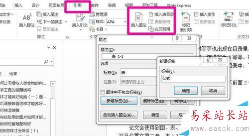 1、引用-插入題注,新建題注,分別建立一個名字為圖,一個名字為表,一個名字為公式的題注。