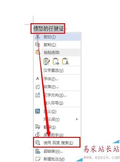 關閉注冊表編輯器,然后打開 Word2013 ,選擇任意字符后右擊,即可發現默認的搜索引擎已經變成了 使用百度搜索 。點擊 是用百度搜索 :