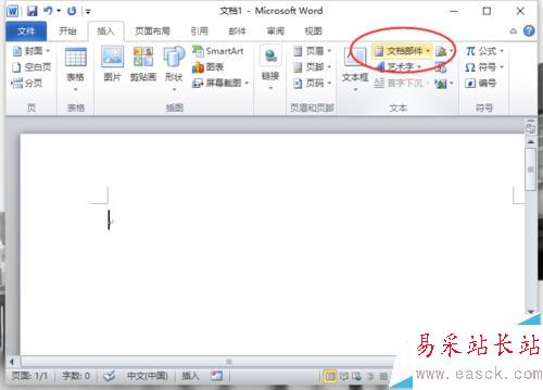 3、在“插入”選項(xiàng)卡的“文本”分組區(qū)域中點(diǎn)擊“文檔部件”按鈕。如圖所示;