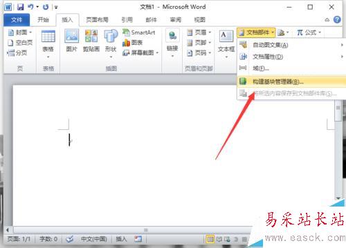 4、點(diǎn)擊“文檔部件”按鈕后,在彈出的下來列表菜單選項(xiàng)中點(diǎn)擊“構(gòu)建基塊管理器”選項(xiàng)。如圖所示;