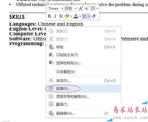 3、首先將鼠標光標置于出現問題的那一段,然后右擊鼠標,選擇“段落”