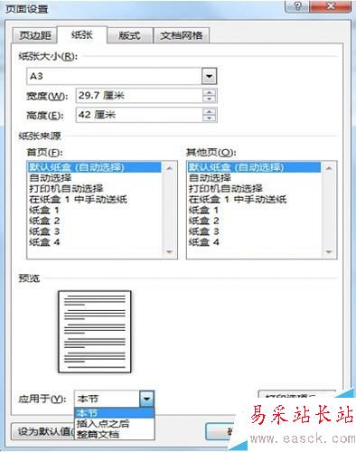 2、頁面設置——紙張——在“應用于”可以選擇(本節:就是你選中的這個頁面。插入點之后:在這個頁面之后的所有頁面。整篇文檔:就是整個文檔的設置都是一樣的)