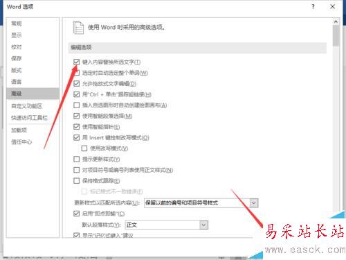 6、在“高級”選項卡欄的右側窗格中,找到“編輯選項”區域下的“鍵入內容替換所選文字”選項,并將其勾選即可。如圖所示;