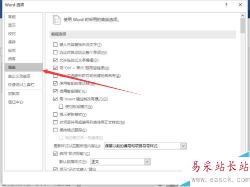5、在“Word選項”對話窗口中,將選項卡切換到“高級”選項卡欄。如圖所示;