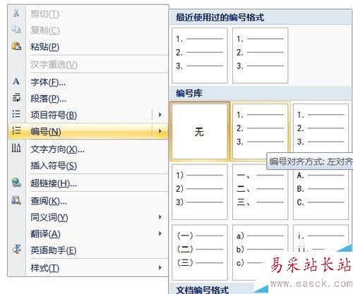 1、鼠標定位在需要插入題號的位置。右鍵——編號,選擇一個需要的編號樣式。這里選擇了第一種。