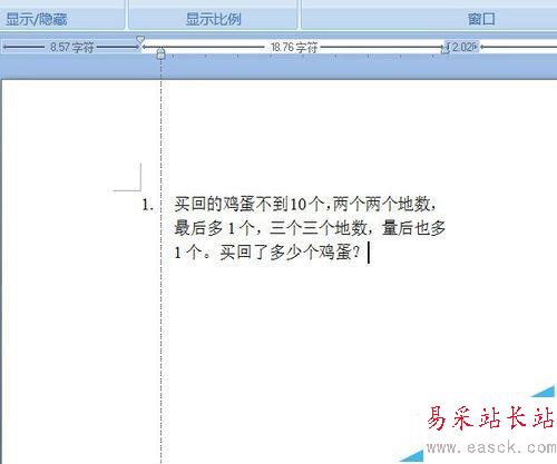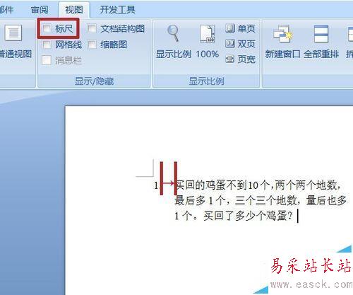3、工具欄中點擊視圖,在顯示/隱藏欄中勾選標尺,將標尺調出。圖中紅線標出的就是編號與文字之間的間距。
