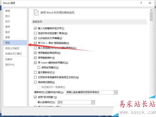 5、在彈出的“Word選項”對話框中,選擇并點擊“高級”選項卡欄。如圖所示;