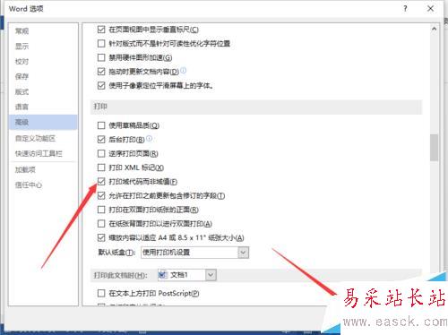 6、在“高級”選項卡的右側窗格中,找到“打印”區域下的“打印域代碼而非域值”選項,并將其復選框勾選即可。如圖所示;
