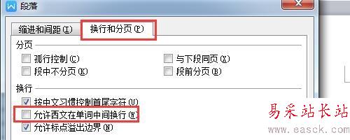 6、點擊換行和分頁欄,在換行中選擇“允許西文在單詞中間換行”,在其前面打上“√”。單擊確定按鈕。