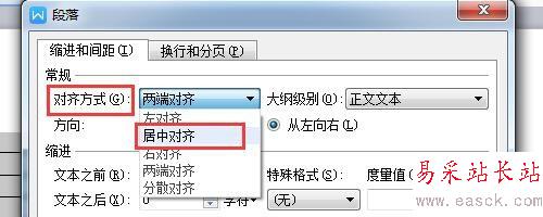 5、縮進和間距欄中,對齊方式選擇居中對齊。