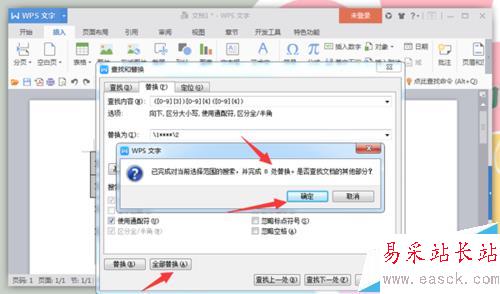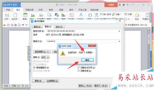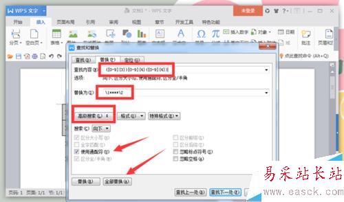 3、在彈出的“查找與替換”對話框中,在查找內容處輸入“([0-9]{3})[0-9]{4}([0-9]{4})”,在替換為處輸入:“/1****/2”。然后選擇“高級搜索”中的“使用通配符”,最后點擊“全部替換”即可。