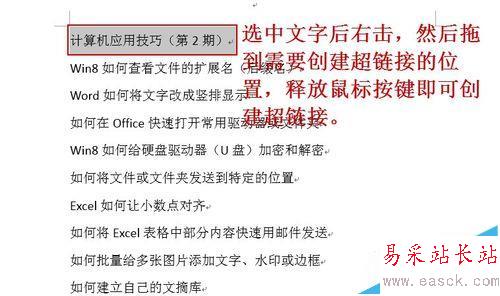 1、用鼠標選中作為目標超鏈接的文字或圖像,然后單擊鼠標右鍵,然后拖到需要創(chuàng)建超鏈接的位置,釋放鼠標按鍵即可創(chuàng)建超鏈接。