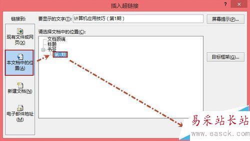 4、創(chuàng)建超鏈接B:打開“插入超鏈接”對話框,選擇“本文檔中的位置”,然后選擇創(chuàng)建好的書簽名,最后單擊“確定”。