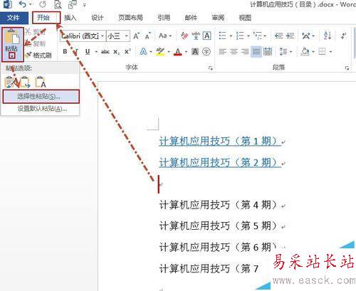 2、將光標定位到要插入超鏈接的位置,然后單擊“開始”選項卡下的“粘貼”—“選擇性粘貼”。