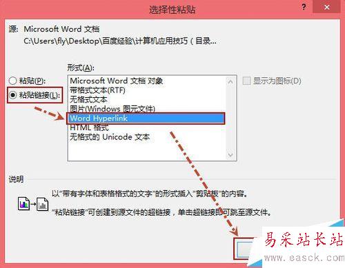 3、打開“選擇性粘貼”對話框,選擇“粘貼鏈接”中的“Word Hyperlink”,然后單擊“確定”。