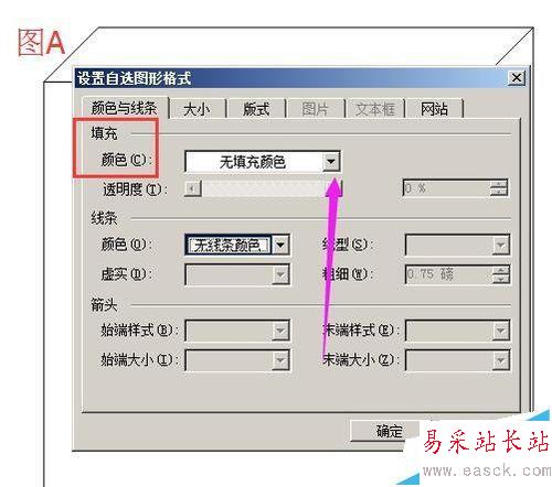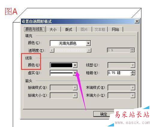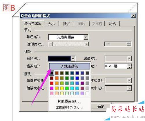 3、在“線條顏色”右側(cè)的三角形點(diǎn)下,如圖A;彈出的菜單中點(diǎn)“無線條顏色”;如圖B;