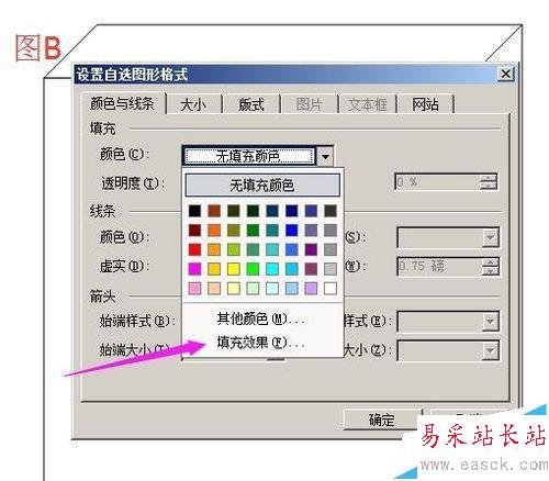 4、在“填充顏色”右側(cè)的三角形點(diǎn)下,如圖A;彈出的菜單中點(diǎn)“填充效果”,如圖B;
