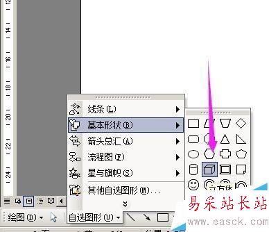 1、新建word文檔,在繪圖工具欄中點(diǎn)“自選圖形”右側(cè)的三角形,彈出的菜單中點(diǎn)“立方體”;然后,在文檔中畫下,畫出立方體圖形。