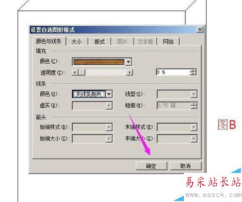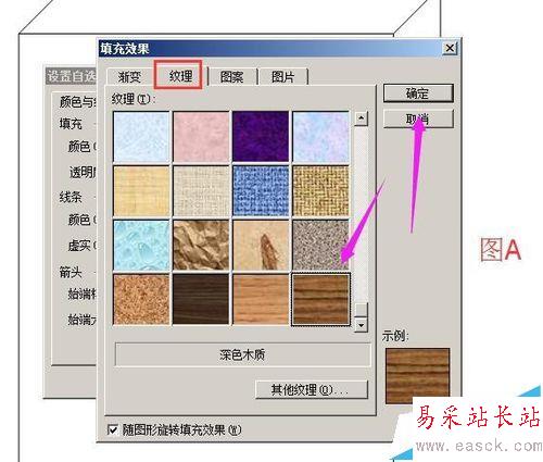 5、轉(zhuǎn)到“填充效果”操作框,點(diǎn)“紋理”,然后點(diǎn)選“深色木質(zhì)”,再點(diǎn)確定,如圖A;點(diǎn)確定后,轉(zhuǎn)回到“自選圖形格式”操作框,再點(diǎn)下確定,如圖B;