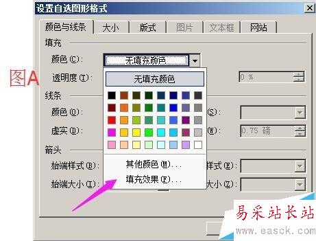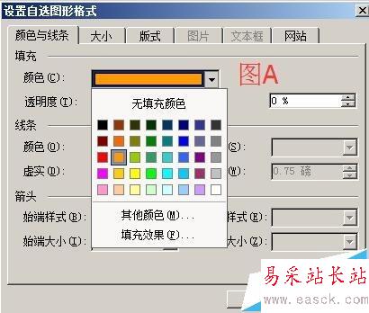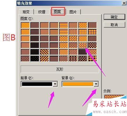 2、雙擊圖形,彈出的“設(shè)置自選圖形格式”操作框;在“線條顏色”右側(cè)的小三角形點(diǎn)下,彈出的菜單中點(diǎn)“無(wú)線條顏色”;在“填充顏色”右側(cè)的小三角形點(diǎn)下,彈出的菜單中點(diǎn)“填充顏色”;如圖A;轉(zhuǎn)到另一操作框,點(diǎn)開(kāi)“圖案”這一頁(yè);在“圖案”這里點(diǎn)選“瓦形”圖案;然后,分別在“背景”和“前景”右側(cè)的三角形點(diǎn)下,彈出的顏色選項(xiàng)中點(diǎn)選自己想要的顏色。然后點(diǎn)確定。