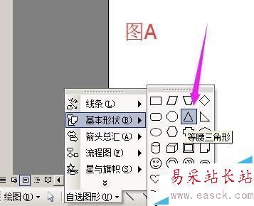 1、新建word文檔;在文檔繪圖工具欄中點(diǎn)“等腰三角形”圖標(biāo);在文檔上畫(huà)下,畫(huà)出圖形,然后把圖形調(diào)整成如圖B的形狀大小;