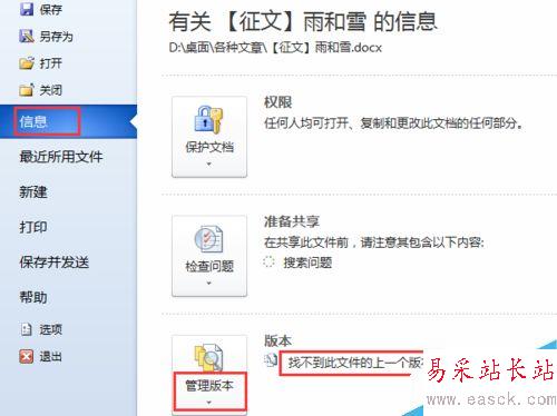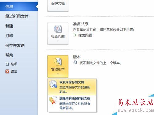 依舊是打開“文件”菜單,在中間看到第三個“管理版本”,如果是已經都保存過的文檔這里會提示“找不到此文件的上一個版本”,而若是存在未保存的文件會顯示自動保存文檔的時間點,上面標明“您可以打開或刪除版本文件,在您關閉此文件之前,系統將刪除大多數自動保存的版本。”