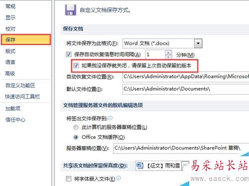 打開Word 2010版本的“文件”菜單,找到并點擊左下角的【選項】按鈕打開設置界面,切換到“保存”頁。在“保存文檔”里,我們需要設置下文檔自動恢復的時間間隔分鐘數,勾選“如果我沒保存就關閉,請保留上次自動保留的版本”這個設置。