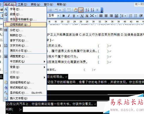 1、在打開的Word文檔中選擇好有背景的文字,單擊菜單欄“格式”——邊框和底紋。
