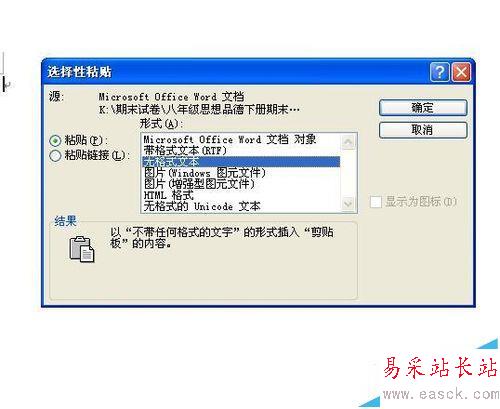 3、在出現(xiàn)的“選擇性粘貼”對話框中選擇“無格式文本”,單擊“確定”。