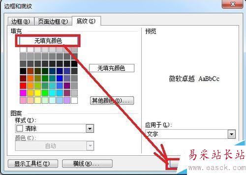 2、在打開的“邊框和底紋”對話框中選擇“底紋”選項(xiàng)卡,單擊“無填充顏色”,單擊“確定”按鈕。