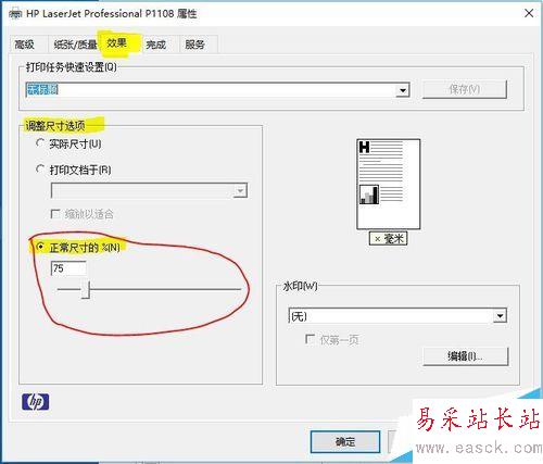 2、進行效果屬性設置:調整尺寸選項,選合適的比例75%(A3縮打A4紙) ,確定后打印即可