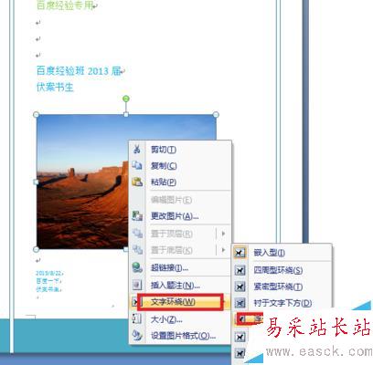 4、整個(gè)頁面看起來比較的空曠,那么讓我們找個(gè)圖片插入進(jìn)來吧。我隨便找了張。粘貼后,選擇右鍵,文字環(huán)繞,浮于文字上方。這樣整個(gè)圖片就可以不受限制的隨意拖動(dòng)位置了
