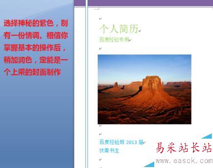 6、雙擊淡青色區(qū)域,你還可以進(jìn)行顏色的更換,讓我們換成女孩子比較青睞的神秘的紫色,是不是整個(gè)頁面別有另一番情調(diào)。本次示范僅演示如何設(shè)計(jì)。具體的美工過程不是一句兩句講得清的,還需自己多為考慮進(jìn)行詳細(xì)的斟酌配色,當(dāng)然也可以參考他人的配色習(xí)慣。這樣的封面比起網(wǎng)上的下載封面。相信即使你作為主考官或者面試官。也會(huì)為面試者加上些許印象分。