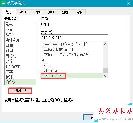 6、刪除自定義格式。在彈出的單元格格式對話框中,選擇“自定義”,選中剛添加的格式,點擊刪除