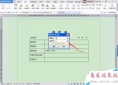 6、在領(lǐng)導(dǎo)批示的后面可以拆分單元格為,1行2列。