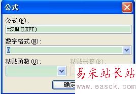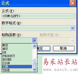 3、然后選擇插入公式的類型和數(shù)據(jù)來源。如SUM是求和,AVERAGE是求平均數(shù)等,LEFT是左邊數(shù)據(jù),ABOVE是上面數(shù)據(jù)。