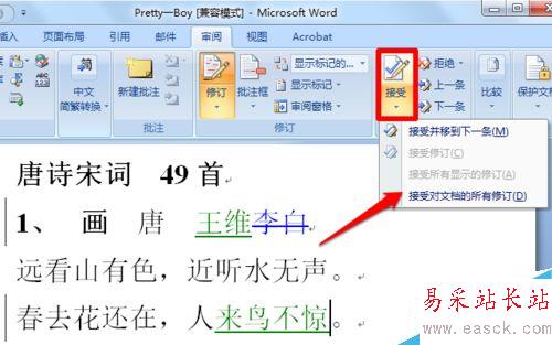 7、將光標定位在被修訂的地方,然后可以選擇word接受修訂或者word接受所有修訂。