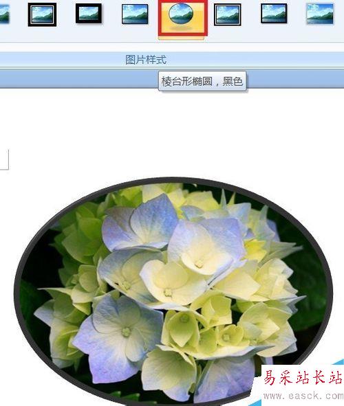 現在選定圖片,在“圖片樣式”列表中選擇一種樣式,比如橢圓,就可以裁剪為橢圓形狀。