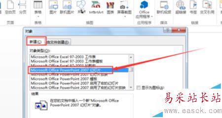 2、打開插入對象窗口后,點擊新建選項卡,然后從列表中選擇“PowerPoint2007幻燈片”,然后點擊“確定”;