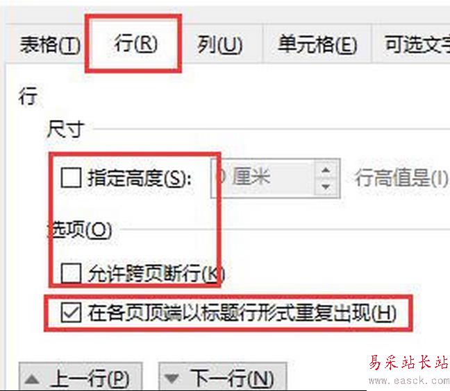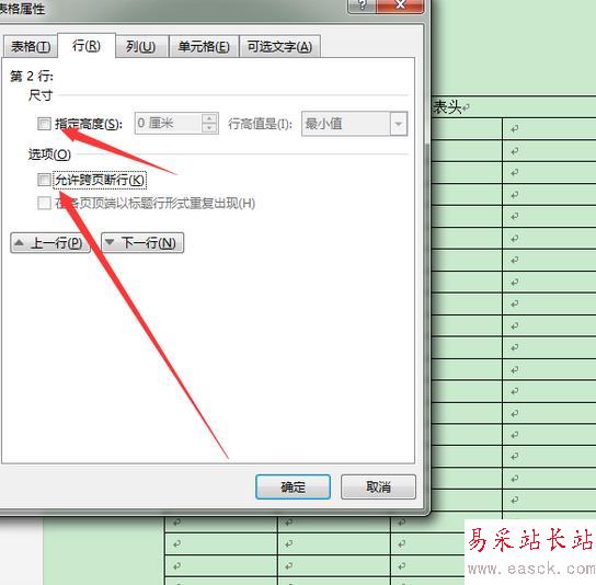 5、在彈出的表格屬性對(duì)話框中選擇“行”選項(xiàng)卡,把“指定高度”和“允許跨行斷行”全面的對(duì)勾去掉。