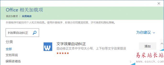 打開應(yīng)用商店后,搜索“文字效果自動糾正”,找到該插件后,點(diǎn)擊其右側(cè)的“添加”。