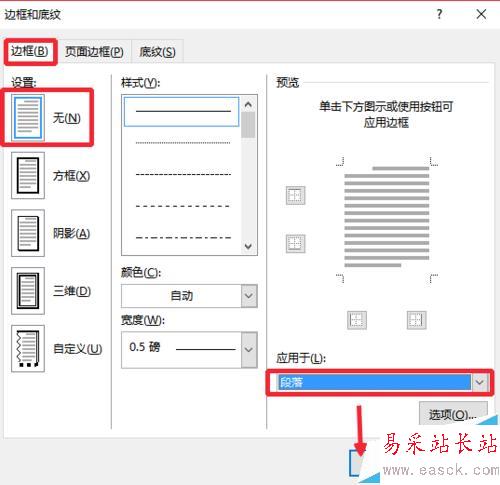 邊框和底紋窗口中,我們按照圖片所示,進行操作,這樣也可以清除頁眉橫線。