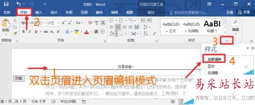 雙擊頁眉,進入頁眉編輯模式,點擊開始菜單,樣式這里點擊這里的箭頭,然后出現的窗口中,我們選擇,這里全部清除格式。這樣頁眉文字格式也會被清除,我們清除格式以后,然后重新設置頁眉文字的格式即可。
