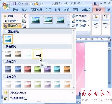 第2步,在打開的Word 2007顏色模式面板中,分別選擇“灰度”、“褐色”、“沖蝕”或“黑白”選項(xiàng)為Word 2007圖片重新著色。或者在“深色變體”和“淺色變體”區(qū)域選擇其他沖蝕效果,如圖所示。