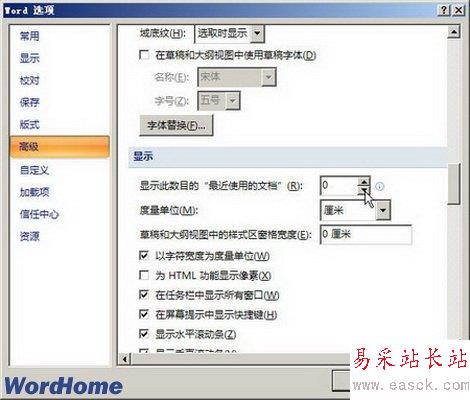 小提示:如果在刪除當前Word文檔歷史記錄后,希望以后繼續使用Word文檔歷史記錄功能,則只需要將“顯示此數目的‘最近使用的文檔’”數值調整為大于0即可。