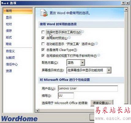 第2步,在打開的“Word選項(xiàng)”對話框中,取消“常用”選項(xiàng)卡中的“選擇時顯示浮動工具欄”復(fù)選框,并單擊“確定”按鈕即可,如圖2所示。