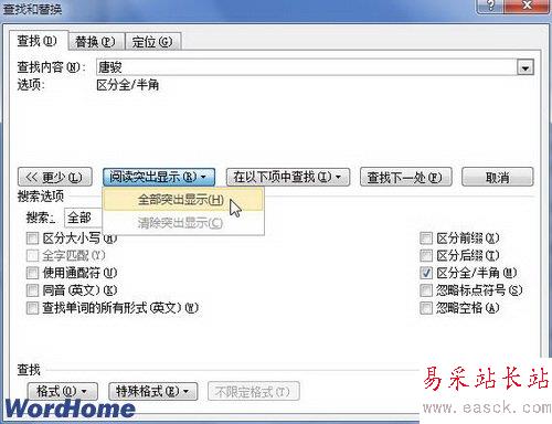 第2步,在打開的“查找和替換”對話框中,在“查找內容”編輯框中輸入要查找的內容,然后單擊“閱讀突出顯示”按鈕,并選擇“全部突出顯示”命令,如圖2所示。