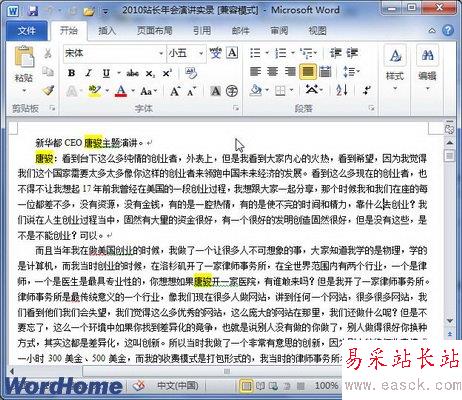 第3步,可以看到所有查找到的內容都被標識以黃色矩形底色,并且在關閉“查找和替換”對話框或對Word2010文檔進行編輯時,該標識不會取消。如果需要取消這些標識,可以選擇“閱讀突出顯示”菜單中的“清除突出顯示”命令,如圖2010081203所示。