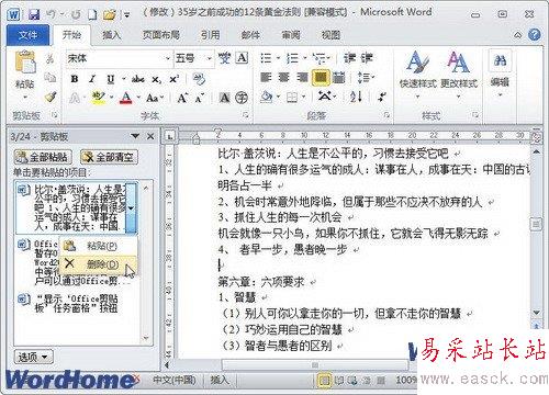 小提示:如果需要刪除Office剪貼板中的其中一項內容或幾項內容,可以單擊該項目右側的下拉三角按鈕,在打開的下拉菜單中執行“刪除”命令,如圖3所示。