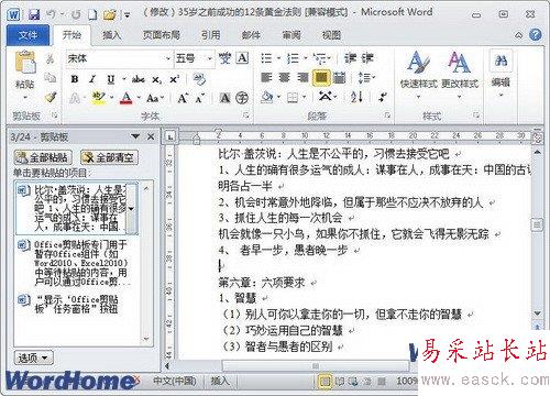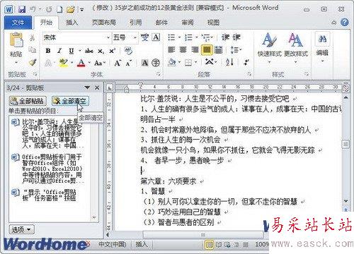 第2步,在打開的Word2010“剪貼板”任務窗格中可以看到暫存在Office剪貼板中的項目列表,如果需要粘貼其中一項,只需單擊該選項即可,如圖2所示。